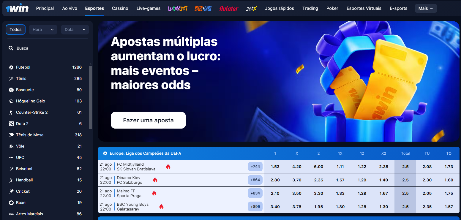 Mais de 30 esportes estão disponíveis para os usuários na seção de esportes. Para jogar no 1win Apostas Esportivas, você precisa se registrar e reabastecer sua conta. Não há modo de demonstração nesta categoria. Usuários do Brasil são oferecidos apostas em futebol, tênis, basquete, vôlei e outros esportes.