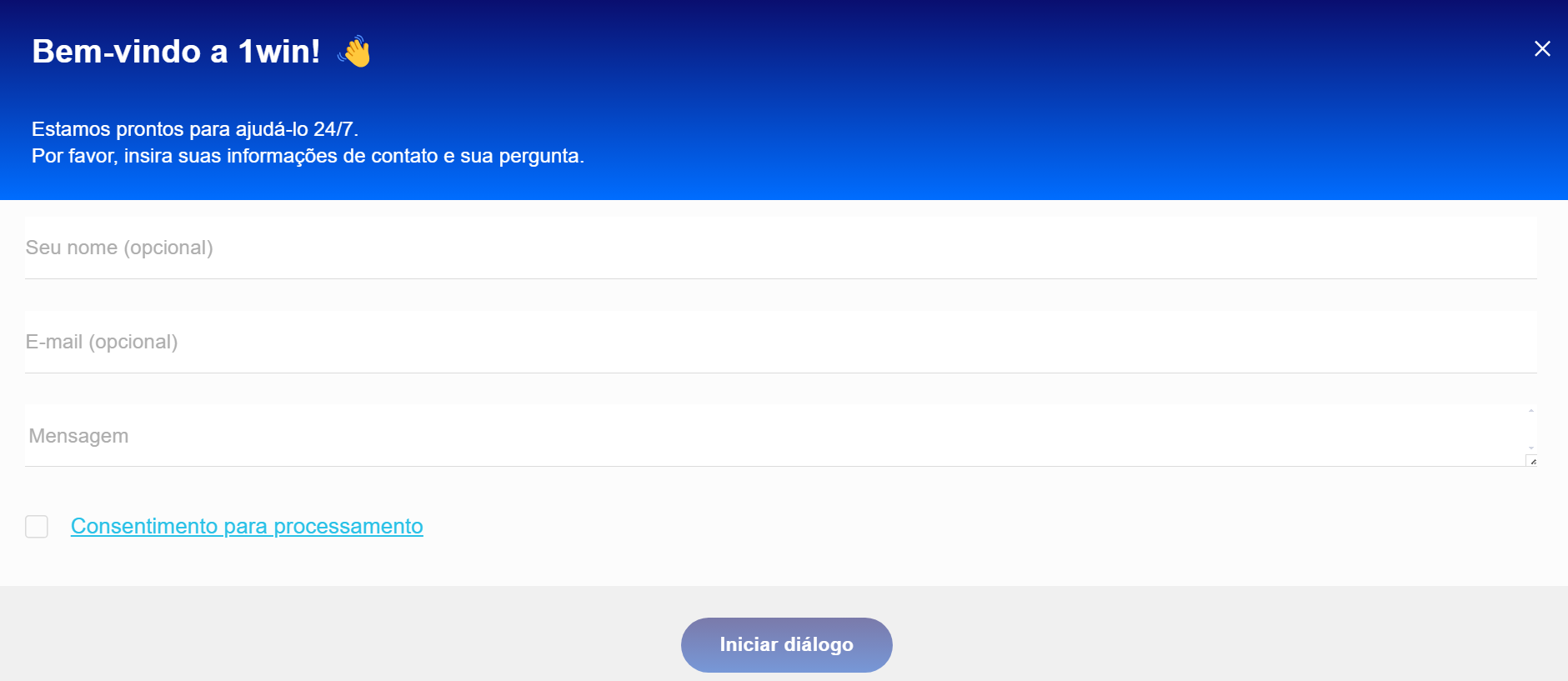 Para resolver qualquer problema, os usuários podem entrar em contato com o suporte 24 horas por dia. O cassino oferece acesso ao e-mail [email protected]. Você também pode entrar em contato com o suporte do 1win clicando no botão de chat ao vivo na parte inferior da tela. O suporte neste modo funciona 24 horas por dia, 7 dias por semana. Você precisa preencher o formulário e enviar uma pergunta e, em seguida, aguardar até 20 minutos para receber uma resposta.