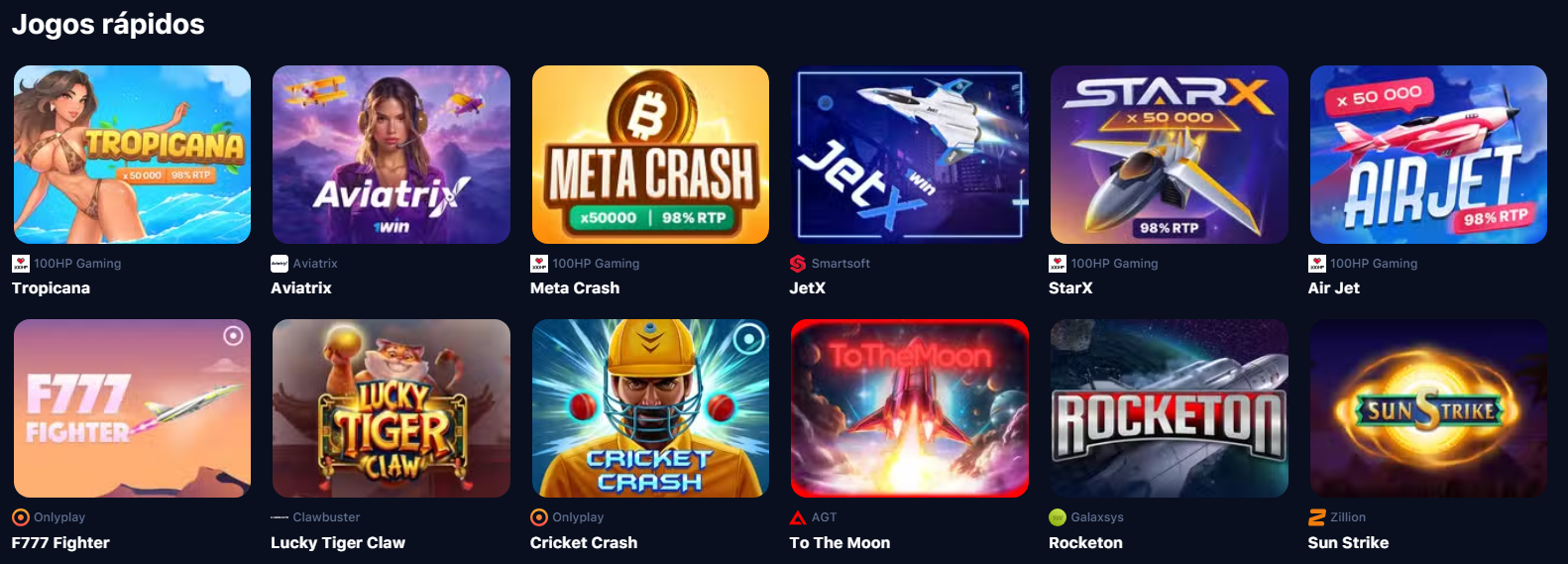 A próxima categoria relevante do site são os jogos rápidos. Nesta seção, os caça-níqueis Crash se tornaram especialmente populares. A ideia principal desta seção do 1win Casino Online no Brasil são pagamentos rápidos e as condições mais simples possíveis. Os usuários recebem um design lacônico e a oportunidade de obter uma vitória instantânea, se for bem-sucedido.